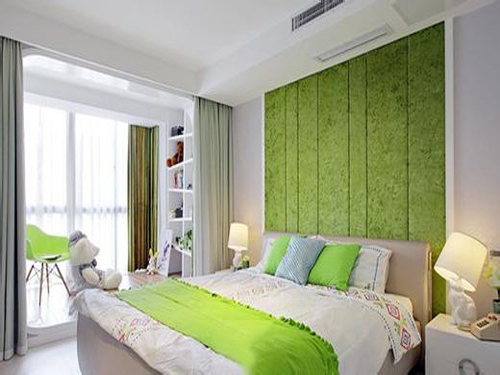 床頭上綠色的軟包裝墻壁跳出了白色的背景墻,顯得別具一格,優(yōu)雅的燈飾,時(shí)尚簡(jiǎn)約的坐凳,綠色的抱枕,樸素的窗簾,共同演繹著春天的風(fēng)情。
