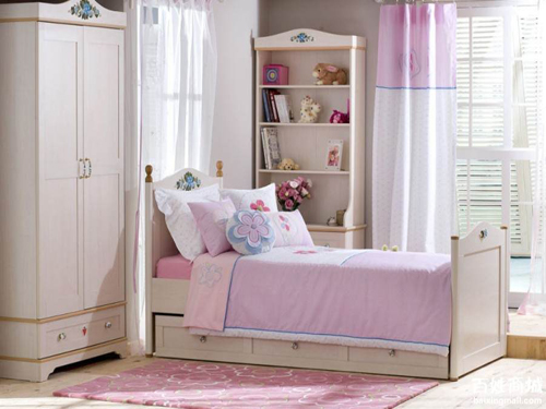 這款公主房的設(shè)計采用了兩種色調(diào),以白色為基色,選用紫粉色的床品,家居來裝點臥室。獨特的心形抽屜拉手讓造型設(shè)計簡單的柜子變得與眾不同;白色的雪紡床幔下波點的公主床,波點的床上用品,波點的床尾凳,波點的椅子,以及波點的娃娃熊,使整個房間內(nèi)透著可愛、靈氣與活潑,置身其中享受著兒時甜甜的粉色記憶。