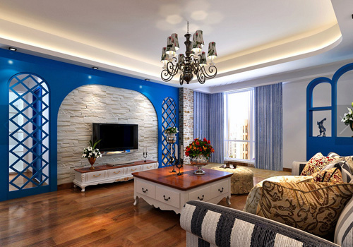 在地中海風(fēng)格中,無論是房屋還是家居的線條,絕不是拘泥于傳統(tǒng)直來直往的線條。獨(dú)特的渾圓造型,更顯自然。唯美復(fù)古的鐵藝吊燈,雪白的墻壁仿佛是被水沖刷過一樣,“!钡奈邓{(lán)和“天”的潔白相結(jié)合,明亮的色彩與紅棕色的地板、桌面及土黃色的抱枕和坐凳交織在一起,將地中海風(fēng)格中強(qiáng)烈的民族色彩描繪的淋漓盡致。