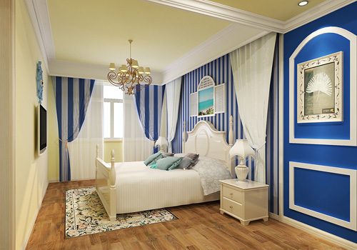 這間臥室的設(shè)計(jì),還是以地中海常見的藍(lán)白兩色為主色調(diào),黃色的木質(zhì)地板,素雅藍(lán)白格子花紋的窗簾與床頭背景墻上的圖案結(jié)合恰當(dāng)好處。床頭上設(shè)計(jì)的拱形景中窗可謂是此間臥室的一大亮點(diǎn),給人以視覺上的延伸感,仿佛真的打開窗戶就可以看見海似的。