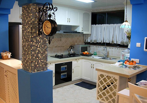 自然的原木、天然的石材是這間開放式廚房的主要裝飾材料,吊頂柜的設(shè)計(jì),充分地利用了廚房的每一寸空間,不僅不會(huì)顯得局促,反而更顯大方大氣。造型獨(dú)特的掛鐘,是地中海風(fēng)格獨(dú)特的美學(xué)產(chǎn)物。家居柔和自然的色彩,簡潔輕快的線條裝飾,帶著濃濃的純樸氣息,縱然時(shí)光流逝,日久彌新。馬賽克拼接的羅馬柱成為了廚房中的一個(gè)看點(diǎn),讓充斥著古樸味道的廚房中帶來了一絲華麗,這種拼接藝術(shù)裝飾,是地中海風(fēng)格中較為重要的一種元素。