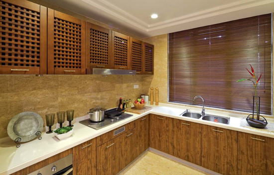 東南亞風格廚房設計運用的石材、原木定制品較為普遍,色調多為棕色、深木色這類的帶自然感覺的顏色,給人以沉穩(wěn)、原始、自然的感覺。利用細節(jié)與色彩點綴其中的的巧妙手法,使之跳出了普通設計,使得熱帶的東南亞自然風情更顯濃郁。
