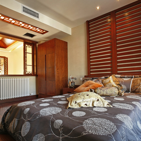 臥室的設計色調多選用深木色,線條簡約的木質家具,自然逼真的花紋,金色布料制成的抱枕、床上用品等裝飾品,與燈光光線的交織在一起,營造出內斂謙卑,舒適溫馨的感覺。